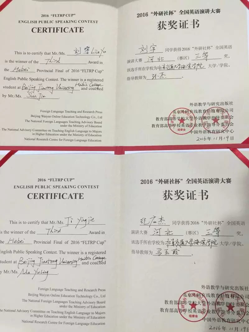 2016年11月18日—20日,河北省高等学校第十七届“世纪之星”英语演讲大赛在唐山师范学院举行,来自全省73所高校的481名参赛选手及其指导教师参加了比赛。经过两天的激烈角逐,最终,我校外语系教师宋琳琳荣获“青年教师组”二等奖,基础教学部大学英语教研室教师孙杰荣获“青年教师组”三等奖,交运系学生刘宇、计科系学生纪应杰、外语系学生闫建超荣获大赛三等奖,基础教学部大学英语教研室主任马玉玲荣获优秀指导教师奖。