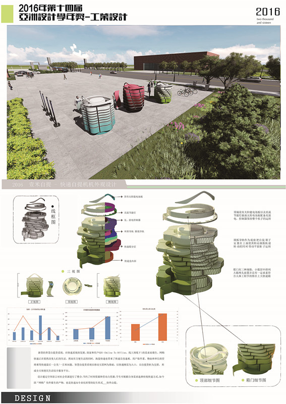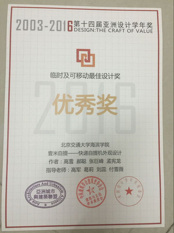 近日,“亚洲设计学年奖”奖项揭晓。我校艺术系2012级环境艺术设计专业毕业设计作品“壹米自提—快递自提机外观设计”荣获“临时及可移动最佳设计奖”优秀奖。我校参赛学生为郝聪、张巨峰、孟宪龙,参赛作品指导教师为高军、葛莉、刘蕊、付雪薇。