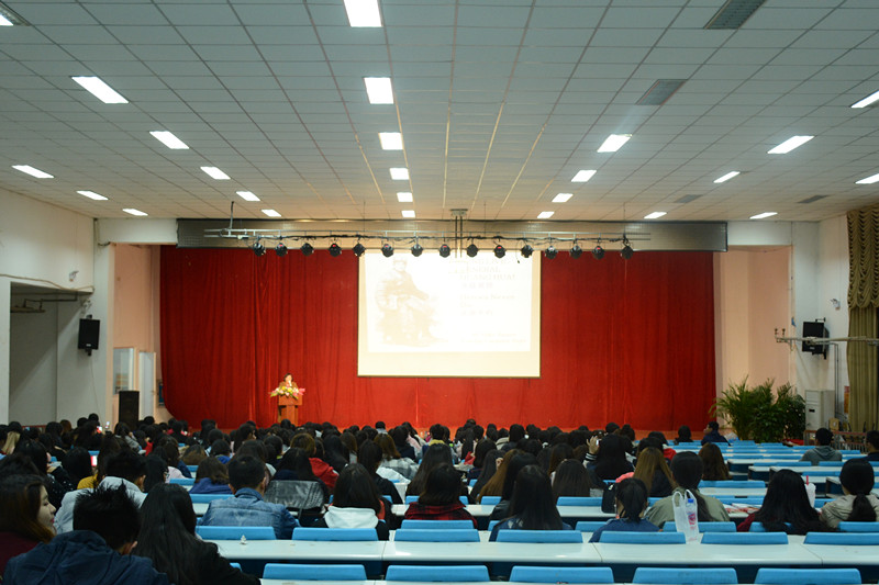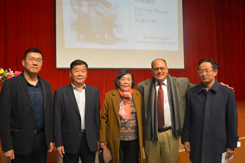 为展示烈士黄骅英雄事迹,弘扬黄骅精神,提高我校学生的英语听说能力,10月26日晚7点,我校美籍外教Michael Tucker在报告厅作了题为《黄骅英雄精神永存》的专题讲座。黄骅市常务副市长贾兆德,黄骅烈士女儿黄鲁彬,我院院长、党委书记王化深、党委副书记魏炜及相关职能处室负责人出席了讲座,全体外语系学生共同聆听讲座。讲座由党委副书记魏炜主持。