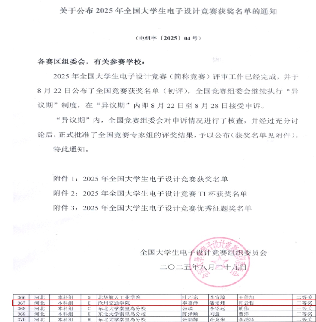 8月29日,2025年全国大学生电子设计竞赛全国总决赛获奖名单正式公布。由我校电子与电气工程学院高贝贝、郭宝军两位老师指导,李嘉泽、潘培炜、许云哲三位同学组成的省级优秀参赛队凭借作品《简易自行瞄准装置(E 题)》荣获全国二等奖。